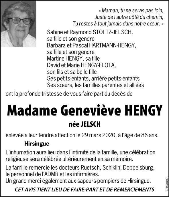 Décédée à Hirsingue (68560, France) le dimanche 29 mars 2020 à l'âge de 86 ans