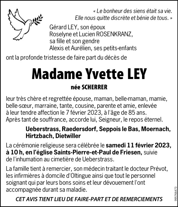 Décédée à Sentheim (68780, France) le mardi 7 février 2023 à l'âge de 85 ans