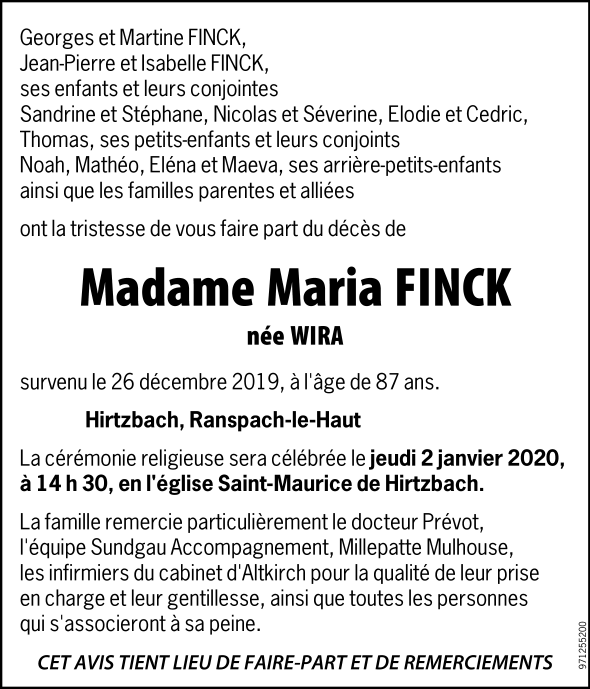 Décédée à Hirtzbach (68118, France) le jeudi 26 décembre 2019 à l'âge de 87 ans