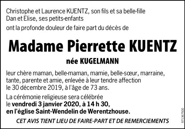 Décédée à Feldbach (68640, France) le lundi 30 décembre 2019 à l'âge de 73 ans