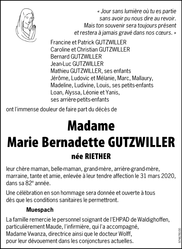Madame Marie Bernadette GUTZWILLER née RIETHER