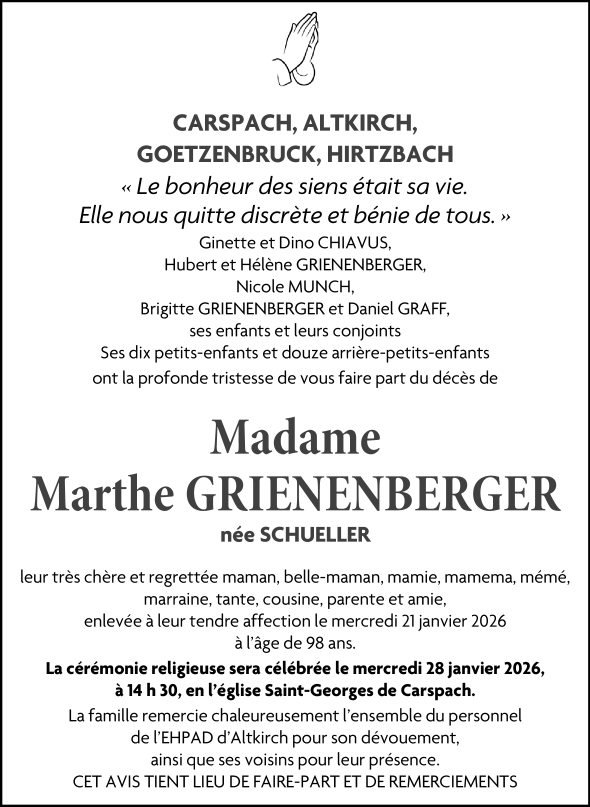 Décédée à Altkirch (68130, France) le mercredi 21 janvier 2026 à l'âge de 98 ans