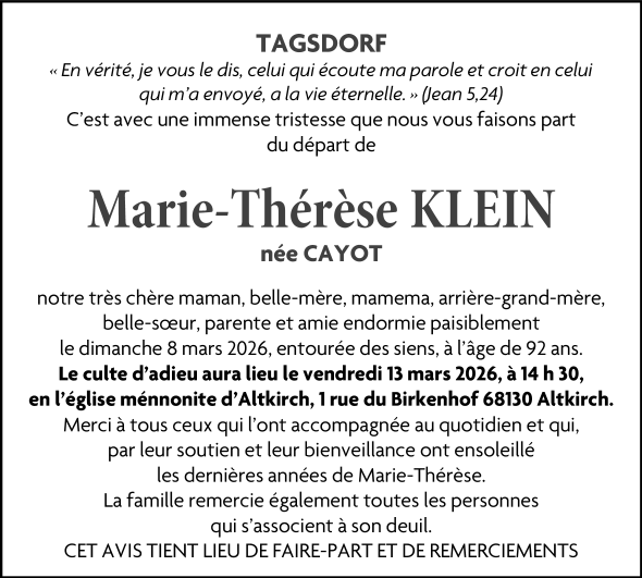 Décédée à Tagsdorf (68130, France) le dimanche 8 mars 2026 à l'âge de 92 ans