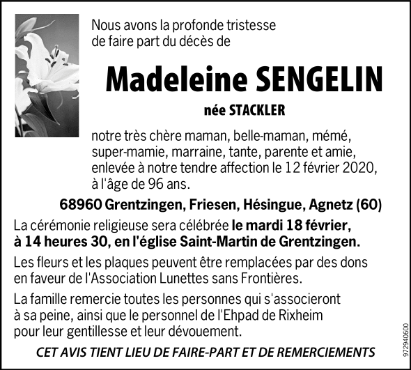 Décédée à Rixheim (68170, France) le mercredi 12 février 2020 à l'âge de 96 ans