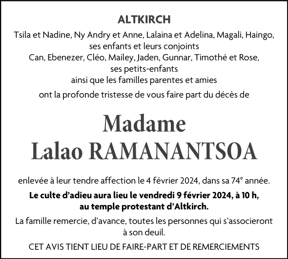 Décédée à Mulhouse (68100, France) le dimanche 4 février 2024 à l'âge de 73 ans