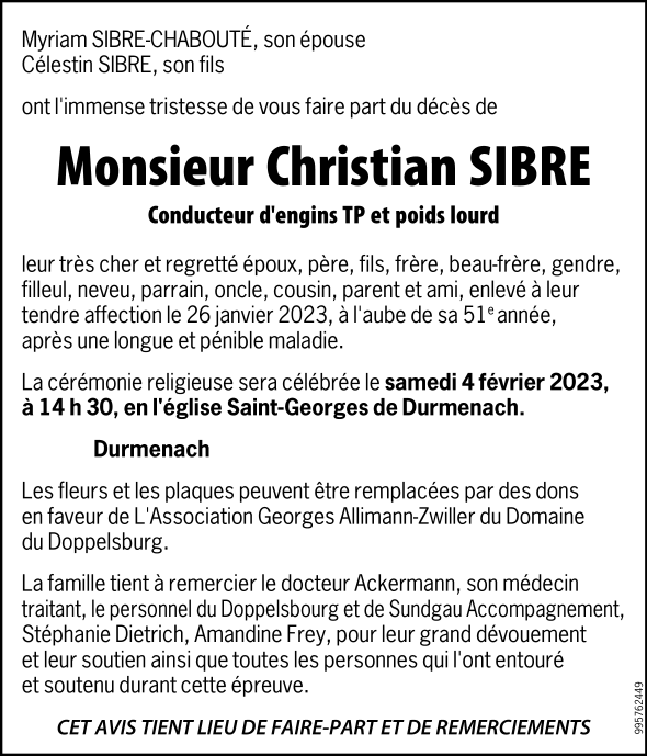 Décédé à Durmenach (68480, France) le jeudi 26 janvier 2023 à l'âge de 50 ans