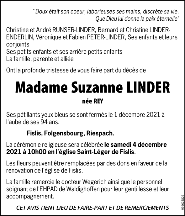 Décédée à Waldighofen (68640, France) le mercredi 1 décembre 2021 à l'âge de 93 ans