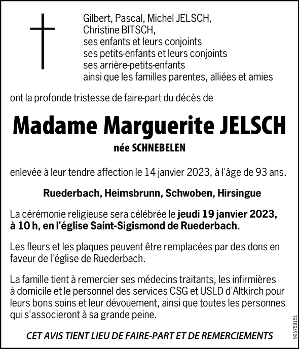 Décédée à Altkirch (68130, France) le samedi 14 janvier 2023 à l'âge de 93 ans