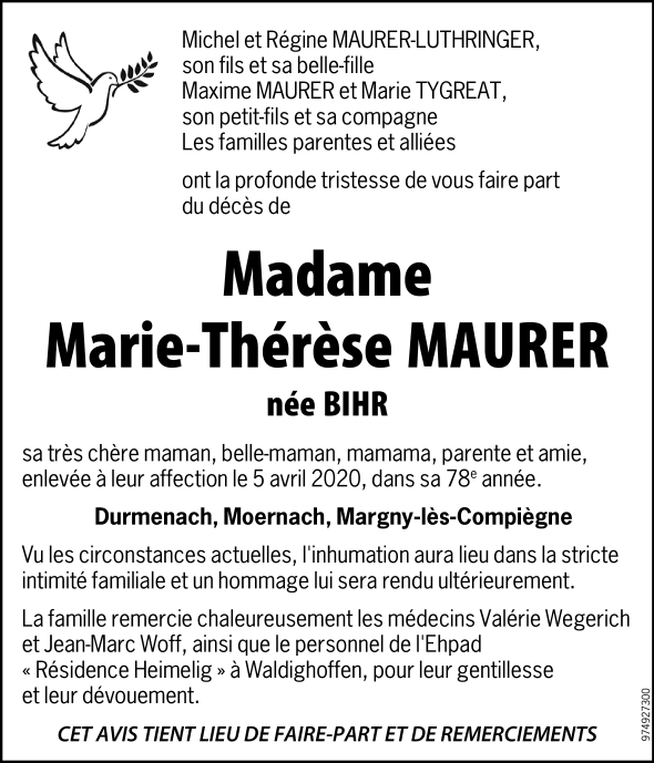 Madame Maire-Thérèse MAURER née BIHR