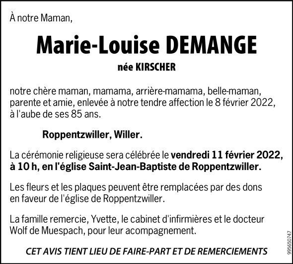 Décédée à Mulhouse (68100, France) le mardi 8 février 2022 à l'âge de 84 ans