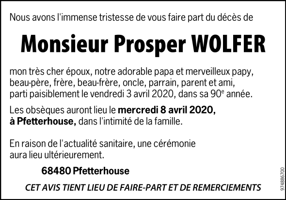 Décédé à Pfetterhouse (68480, France) le vendredi 3 avril 2020 à l'âge de 89 ans