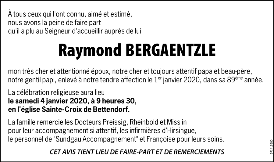 Décédé à Bettendorf (68560, France) le mercredi 1 janvier 2020 à l'âge de 88 ans