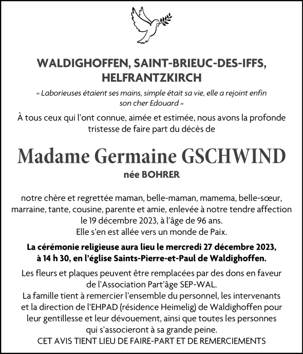 Décédée à Waldighofen (68640, France) le mardi 19 décembre 2023 à l'âge de 96 ans