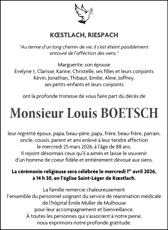 Décédé à Mulhouse (68100, France) le mercredi 25 mars 2026 à l'âge de 88 ans