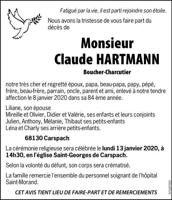 Décédé à Altkirch (68130, France) le mercredi 8 janvier 2020 à l'âge de 83 ans