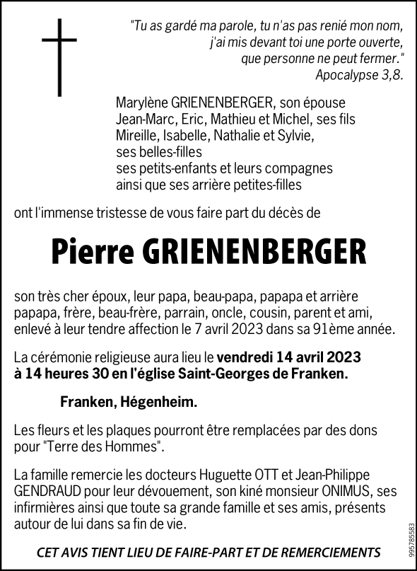Décédé à Franken (68130, France) le vendredi 7 avril 2023 à l'âge de 90 ans