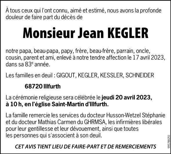 Décédé à Mulhouse (68100, France) le lundi 17 avril 2023 à l'âge de 82 ans