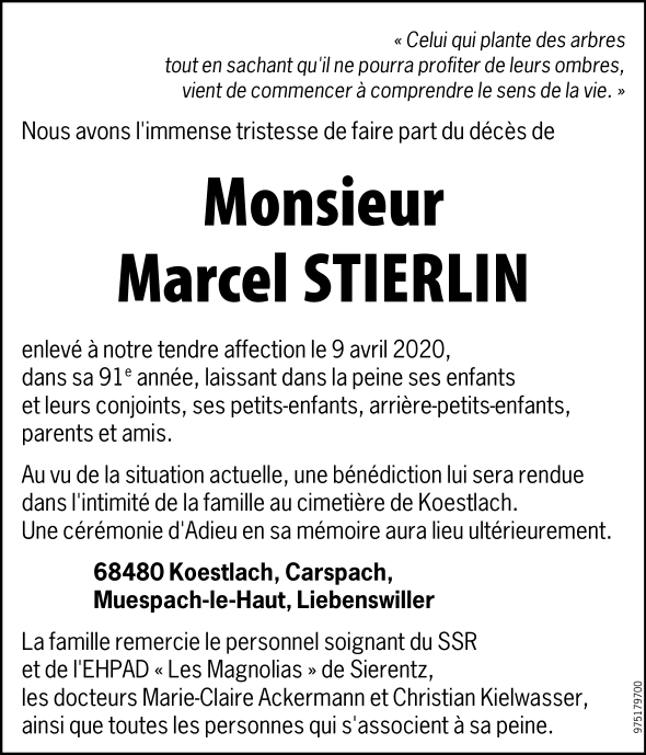 Décédé à Sièrentz (68510, France) le jeudi 9 avril 2020 à l'âge de 90 ans