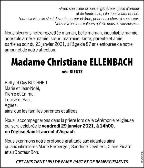 Madame Christiane ELLENBACH née BIENTZ