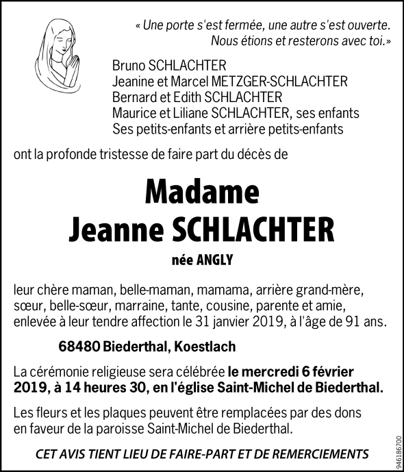 Madame Metha dite "Jeanne" SCHLACHTER née ANGLY