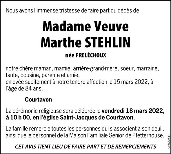 Madame Marthe STEHLIN née FRELÉCHOUX