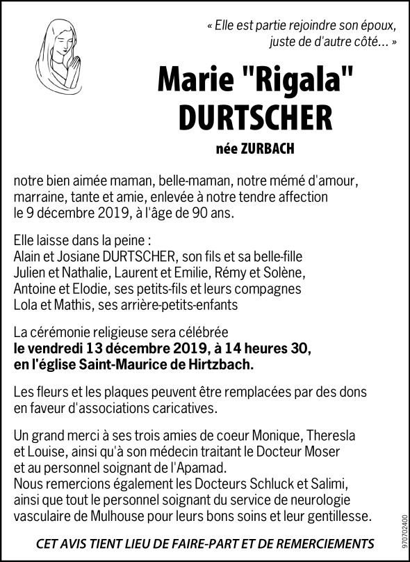 Décédée à Mulhouse (68100, France) le lundi 9 décembre 2019 à l'âge de 90 ans