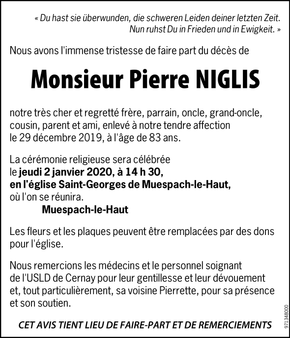 Décédé à Cernay (68700, France) le dimanche 29 décembre 2019 à l'âge de 83 ans