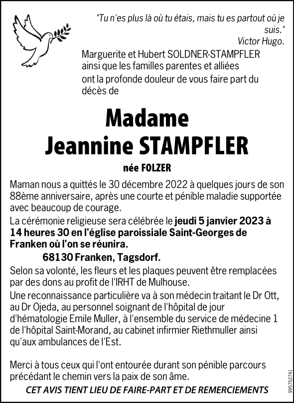Madame Jeannine Mariette STAMPFLER née FOLZER