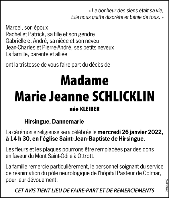 Madame Marie Jeanne SCHLICKLIN née KLEIBER